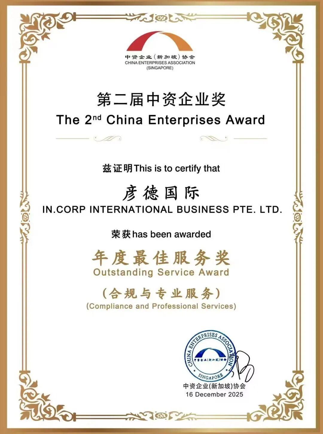 在本次活动中,彦德国际凭借合规领域的硬核实力与专业服务的表现,斩获“年度最佳服务奖(合规与专业服务)”。这份奖项,不仅是对彦德国际深耕新加坡市场、赋能中企出海综合服务能力的权威认证,也是对我们搭跨境建合作桥梁、驱动行业高质量发展的高度褒奖,更凝练着我们以专业之力夯实中新经贸友谊的初心与担当。12月18日,中资企业协会在《联合早报》刊发全版贺词,这既是行业对这份荣誉的重磅见证,更承载着整个市场对彦德国际的深度信赖与未来厚望。