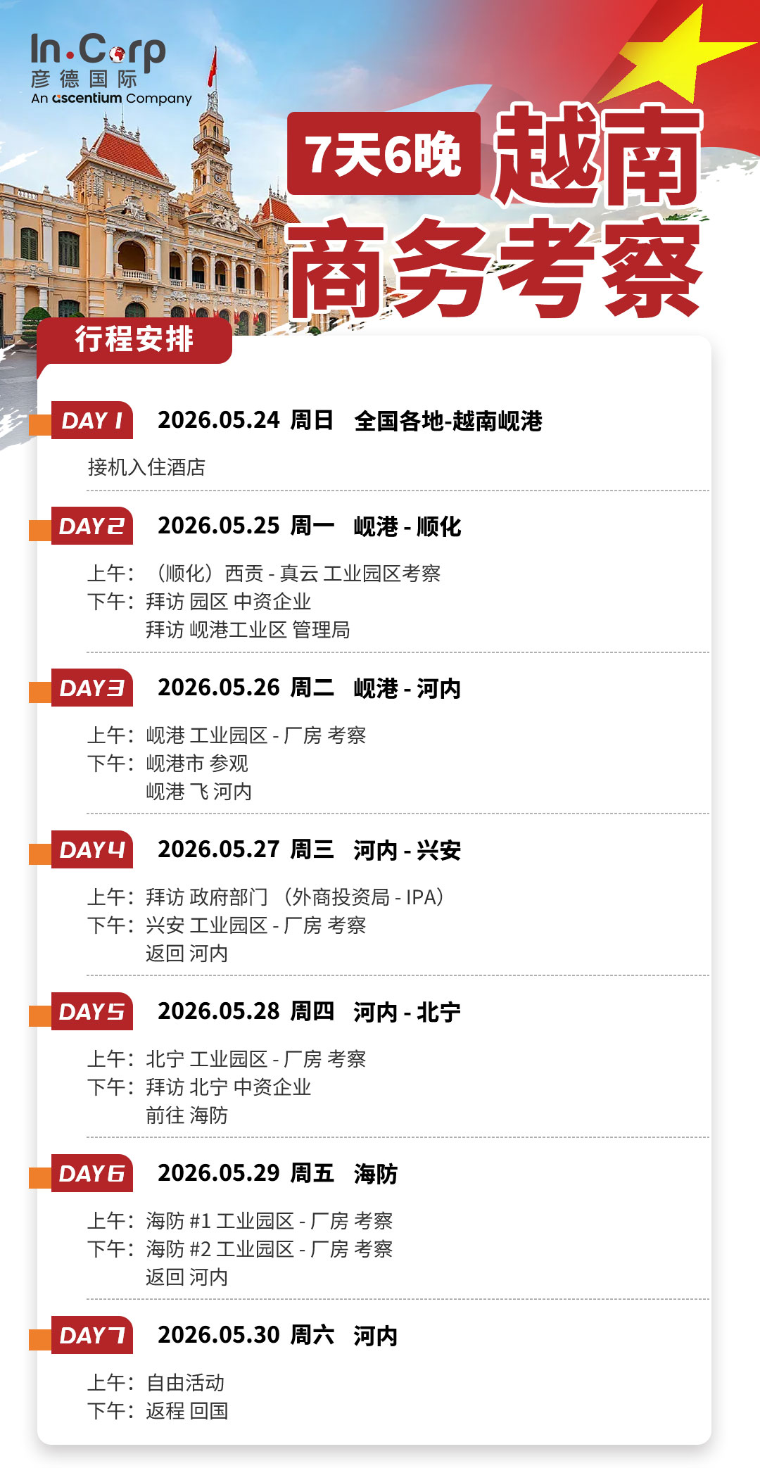 彦德国际深耕中企出海服务,精准把握越南投资政策动态与区域产业格局,为企业提供全流程出海支持。彦德国际计划于2026年5月开启越南实地考察团,组织企业深入走访北部、中部重点工业园区,与园区管理方及当地专业机构直接对接,为布局越南的企业提供一站式选址评估、投资架构设计及合规落地等核心支持。