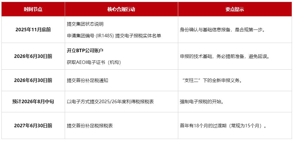 1、提交集团状态说明:收到税务局信函的实体,必须在信件发出后两个月内(通常是2025年11月底前)提交说明,正式确认其集团是否属于受涵盖范围。