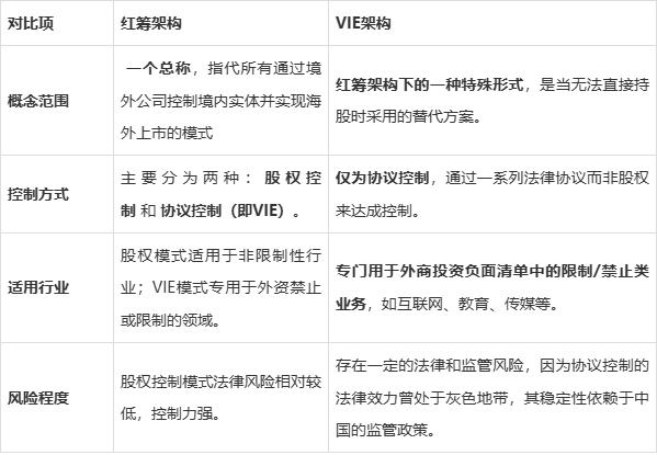 VIE架构是红筹架构的一种。当我们说“搭建红筹架构”时,可能选择股权控制,也可能选择VIE协议控制,具体取决于境内公司所处的行业。