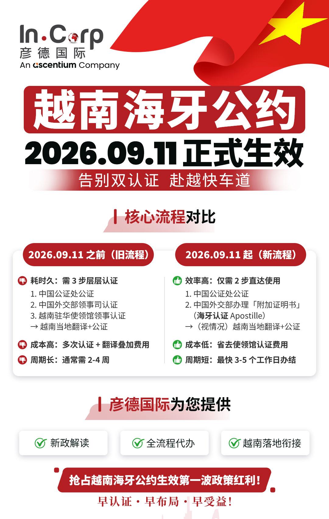 越南实施海牙认证公约,是其行政改革、与国际接轨的重要里程碑。然而,机制的简化并不代表法律审查的消失。文件的真实性、公证的规范性、适用范围的准确性,仍是保障文件有效的核心,是企业不可忽视的合规要求。