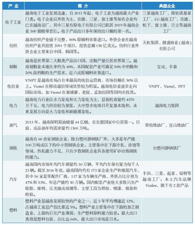 越南处于工业化初期阶段,大部分产业不具备完整的产业链,缺乏高新技术,产品附加值较低。电子、纺织和制鞋是越南发展最快的三大产业。
