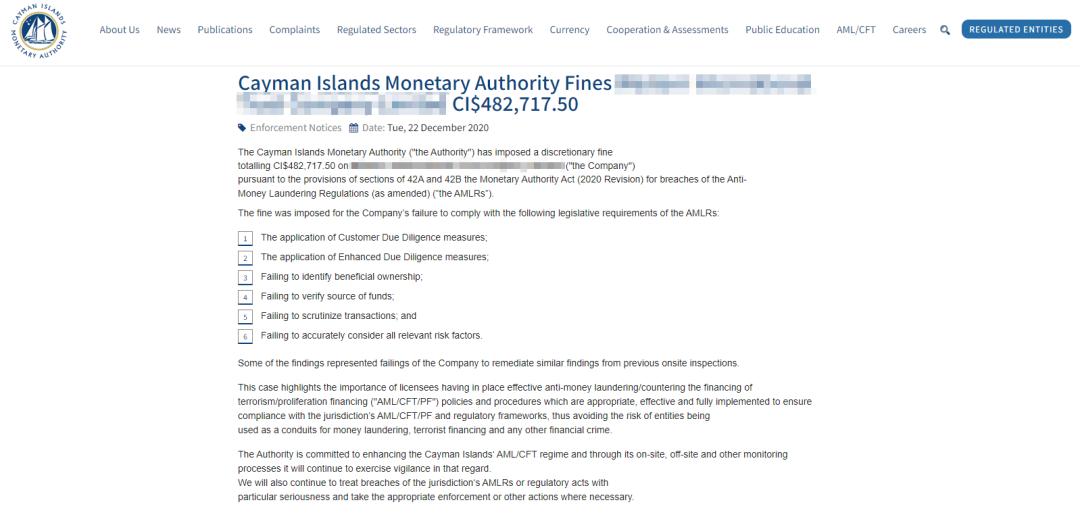 某信托公司因长期未履行合规义务,被开曼群岛金融管理局(CIMA)处以482,717.5开曼元(约合58.8万美元)的巨额罚款。其中,未识别受益所有权是该公司最严重的违规行为之一:公司未能穿透复杂的股权结构确认最终自然人控制者。CIMA指出,监管机构此前已告知存在疏漏,然而公司在后续经营中没有及时整改,最终CIMA行使酌情权,开出巨额罚单。
